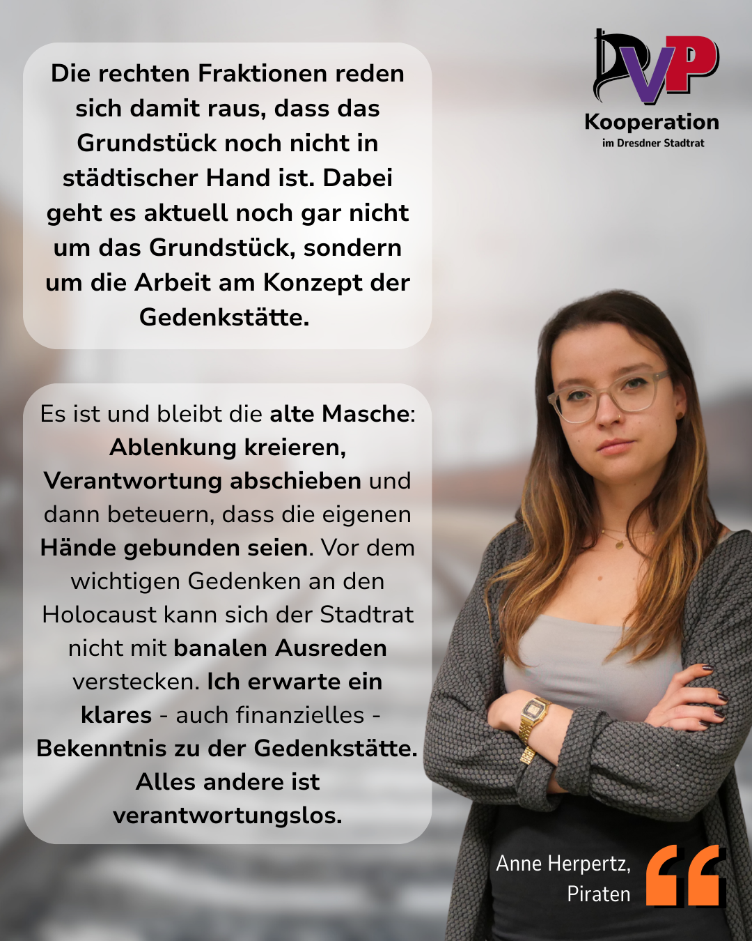 Anne Herpertz (PIRATEN), Stadträtin und erinnerungskulturelle Sprecherin der PVP-Kooperation, kritisiert diese Entscheidung scharf: „Das ist nicht mehr nur fatale Symbolpolitik, sondern die konkrete Sabotage eines Gedenkortes für die Opfer des Holocaust. CDU und FDP machen sich willentlich zu Gehilfen der „erinnerungspolitischen Wende um 180 Grad“, wie sie durch die AfD angestrebt wird. Ich appelliere inständig an die Reste von Anstand und Verantwortungsbewusstsein beider Parteien: Diese Entscheidung muss rückgängig gemacht werden.“